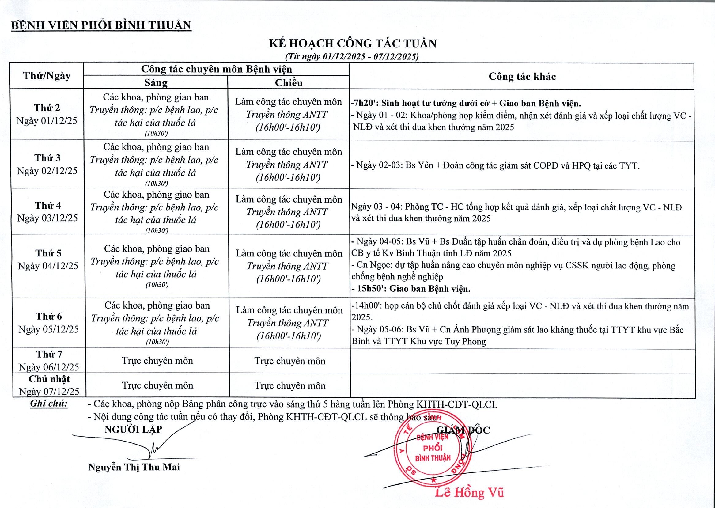 Kế hoạch công tác (01/12/2025 - 07/12/2025) 118441 Đã xem 30/08/2018 Trang chủ Thông báo Ngày đăng: 30/08/2018 File đính kèm: Thông báo khác YÊU CẦU BÁO GIÁ: Máy kiosk lấy số thứ tự ( 25/11/2025 ) Phân lịch trực ứng phó với bão FENGSHEN tại Bệnh viện Phồi Bình Thuận ( 20/10/2025 ) Thư mời chào giá: tư vấn lập E-HSMT và đánh giá E-HSDT, thẩm định E-HSMT và kết quả LCNT gói thầu HC-SP phục vụ công tác xét nghiệm năm 2025-2026 ( 10/10/2025 ) Phân lịch trực ứng phó bão số 9 Ragasa tại Bệnh viện Phồi Bình Thuận ( 24/09/2025 ) Mời chào giá HC-SP-VTTH phục vụ công tác xét nghiệm năm 2025-2026 ( 22/09/2025 ) Mời chào giá phim X-Quang năm 2025 ( 12/08/2025 ) Thư mời chào giá thuốc phục vụ công tác khám chữa bệnh ( 15/07/2025 ) Thư mời chào giá: mua sắm vật tư, hóa chất, sinh phẩm ( 17/06/2025 ) Bản công bố: Cơ sở khám, chữa bệnh đáp ứng yêu cầu là cơ sở thực hành trong đào tạo ngành sức khỏe (bổ sung) ( 15/04/2025 ) Mời chào giá vật tư, hóa chất tháng 4/2025 ( 14/04/2025 )
