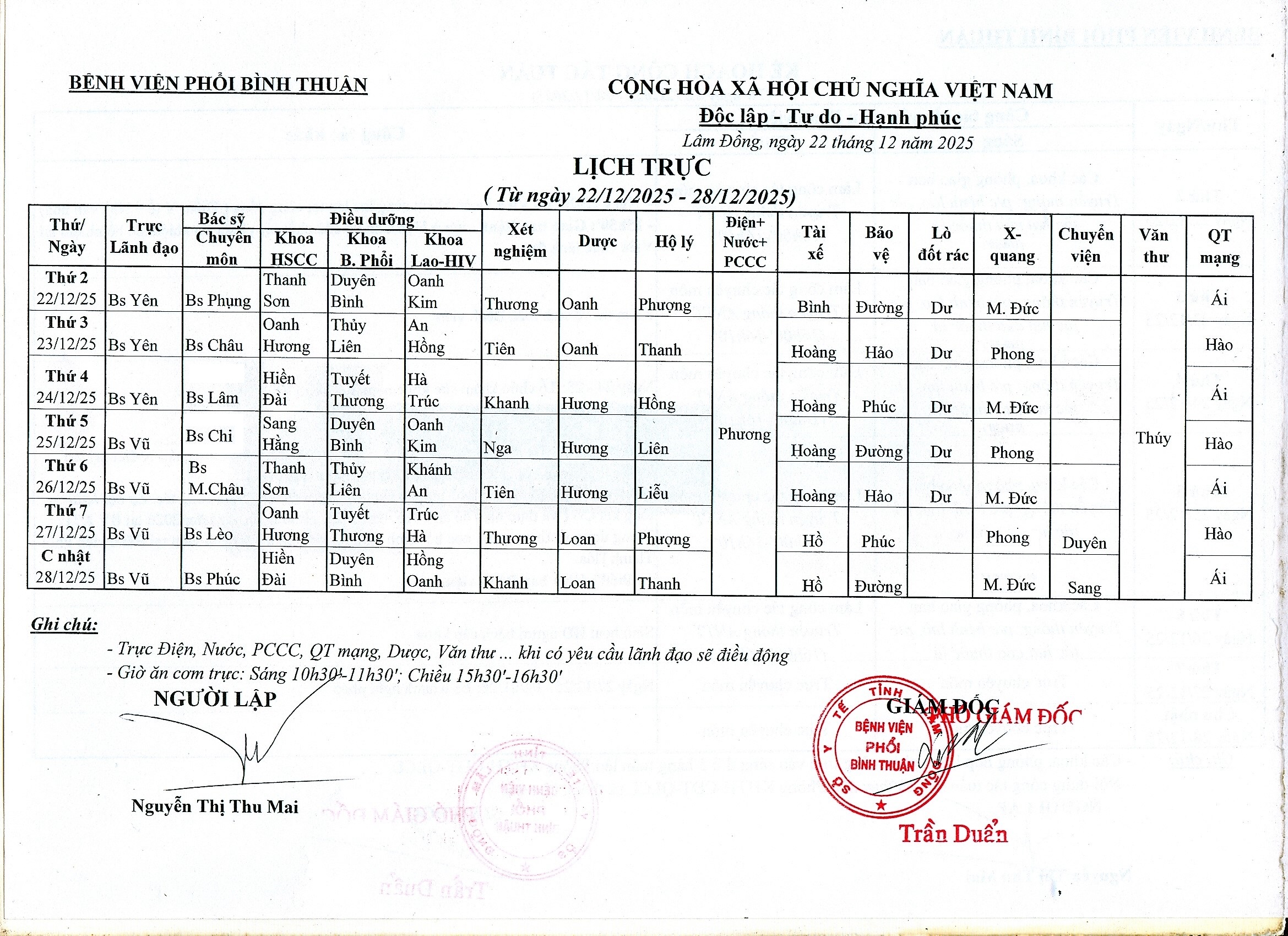 Kế hoạch công tác (22/12/2025 - 28/12/2025) 119882 Đã xem 30/08/2018 Trang chủ Thông báo Ngày đăng: 30/08/2018 File đính kèm: Thông báo khác YÊU CẦU BÁO GIÁ: Máy kiosk lấy số thứ tự ( 25/11/2025 ) Phân lịch trực ứng phó với bão FENGSHEN tại Bệnh viện Phồi Bình Thuận ( 20/10/2025 ) Thư mời chào giá: tư vấn lập E-HSMT và đánh giá E-HSDT, thẩm định E-HSMT và kết quả LCNT gói thầu HC-SP phục vụ công tác xét nghiệm năm 2025-2026 ( 10/10/2025 ) Phân lịch trực ứng phó bão số 9 Ragasa tại Bệnh viện Phồi Bình Thuận ( 24/09/2025 ) Mời chào giá HC-SP-VTTH phục vụ công tác xét nghiệm năm 2025-2026 ( 22/09/2025 ) Mời chào giá phim X-Quang năm 2025 ( 12/08/2025 ) Thư mời chào giá thuốc phục vụ công tác khám chữa bệnh ( 15/07/2025 ) Thư mời chào giá: mua sắm vật tư, hóa chất, sinh phẩm ( 17/06/2025 ) Bản công bố: Cơ sở khám, chữa bệnh đáp ứng yêu cầu là cơ sở thực hành trong đào tạo ngành sức khỏe (bổ sung) ( 15/04/2025 ) Mời chào giá vật tư, hóa chất tháng 4/2025 ( 14/04/2025 )
