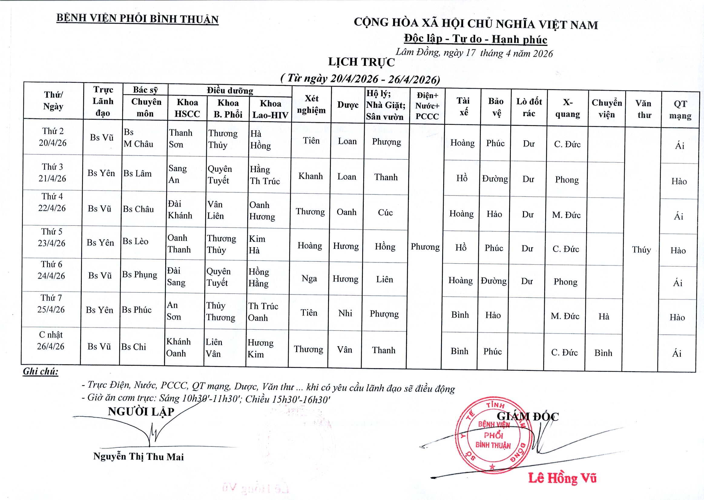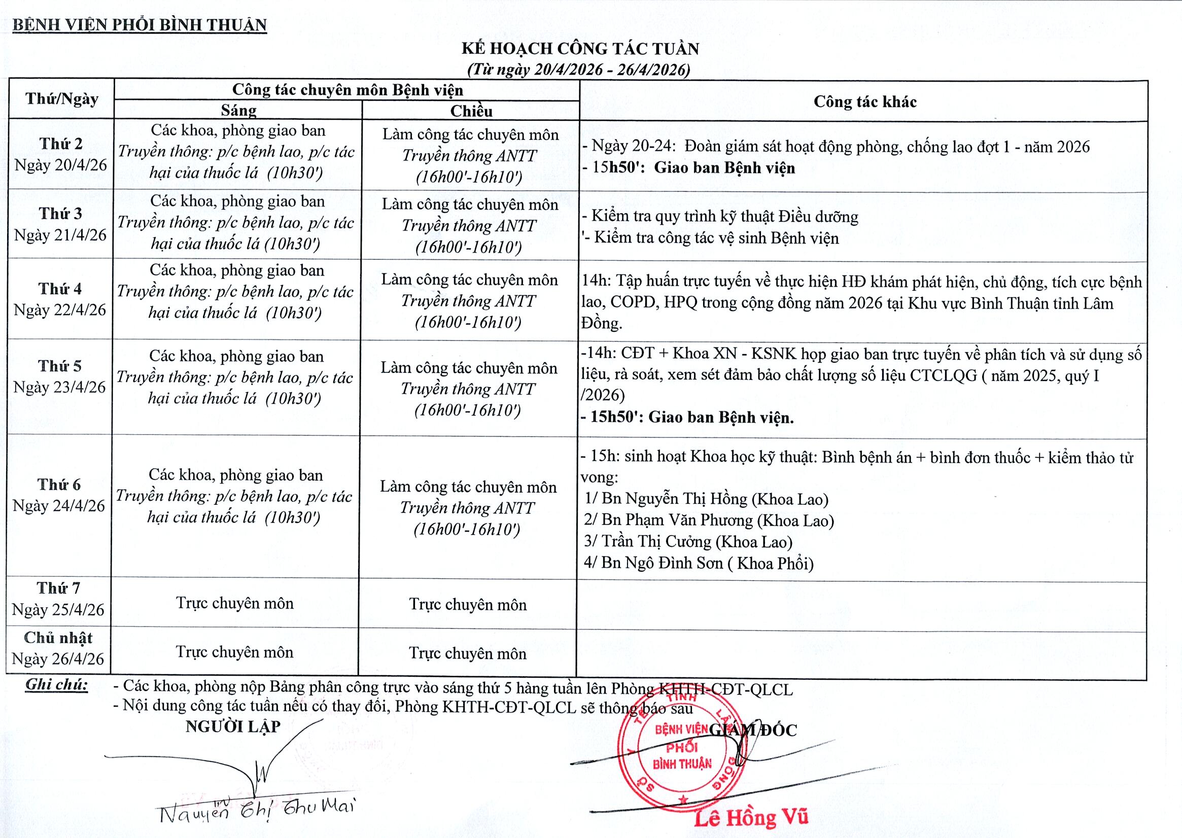 Kế hoạch công tác (20/04/2026 - 26/04/2026)