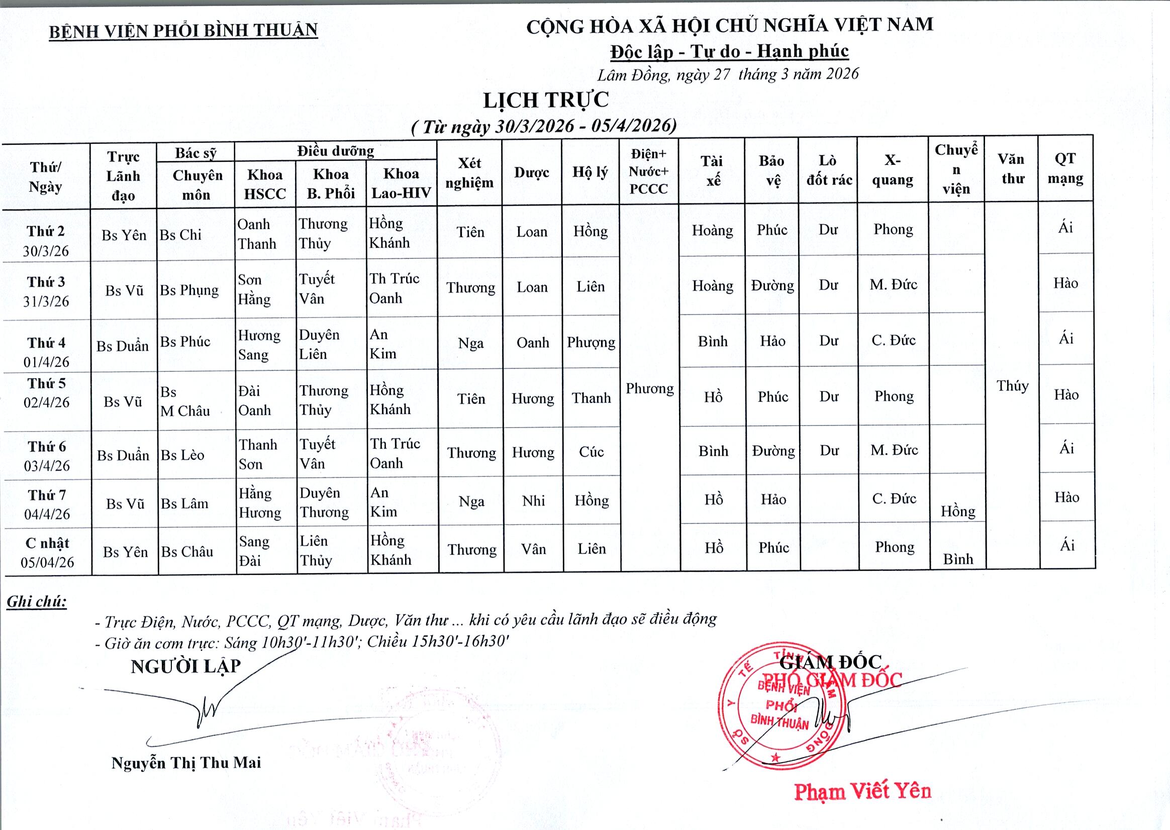 Kế hoạch công tác (30/03/2026 - 05/04/2026)