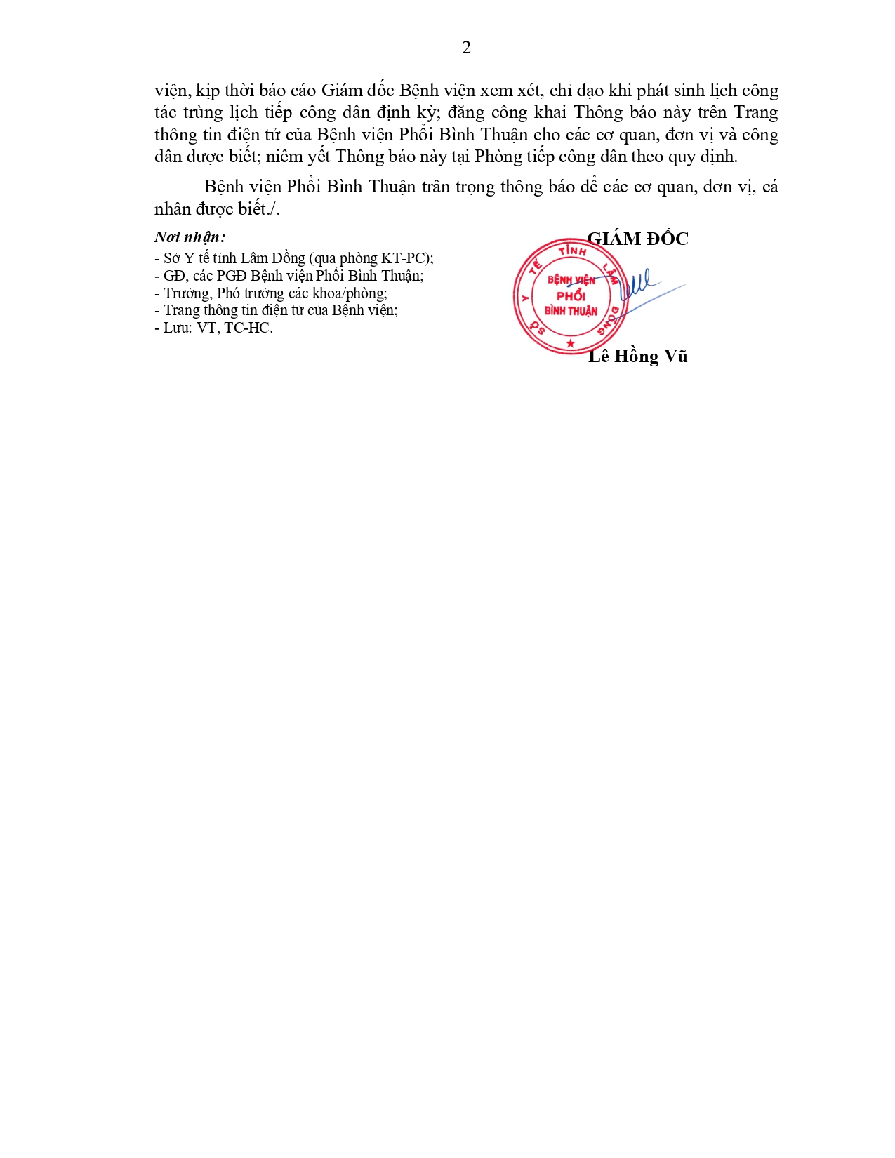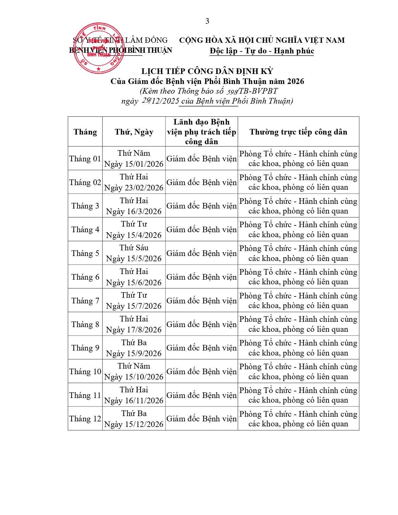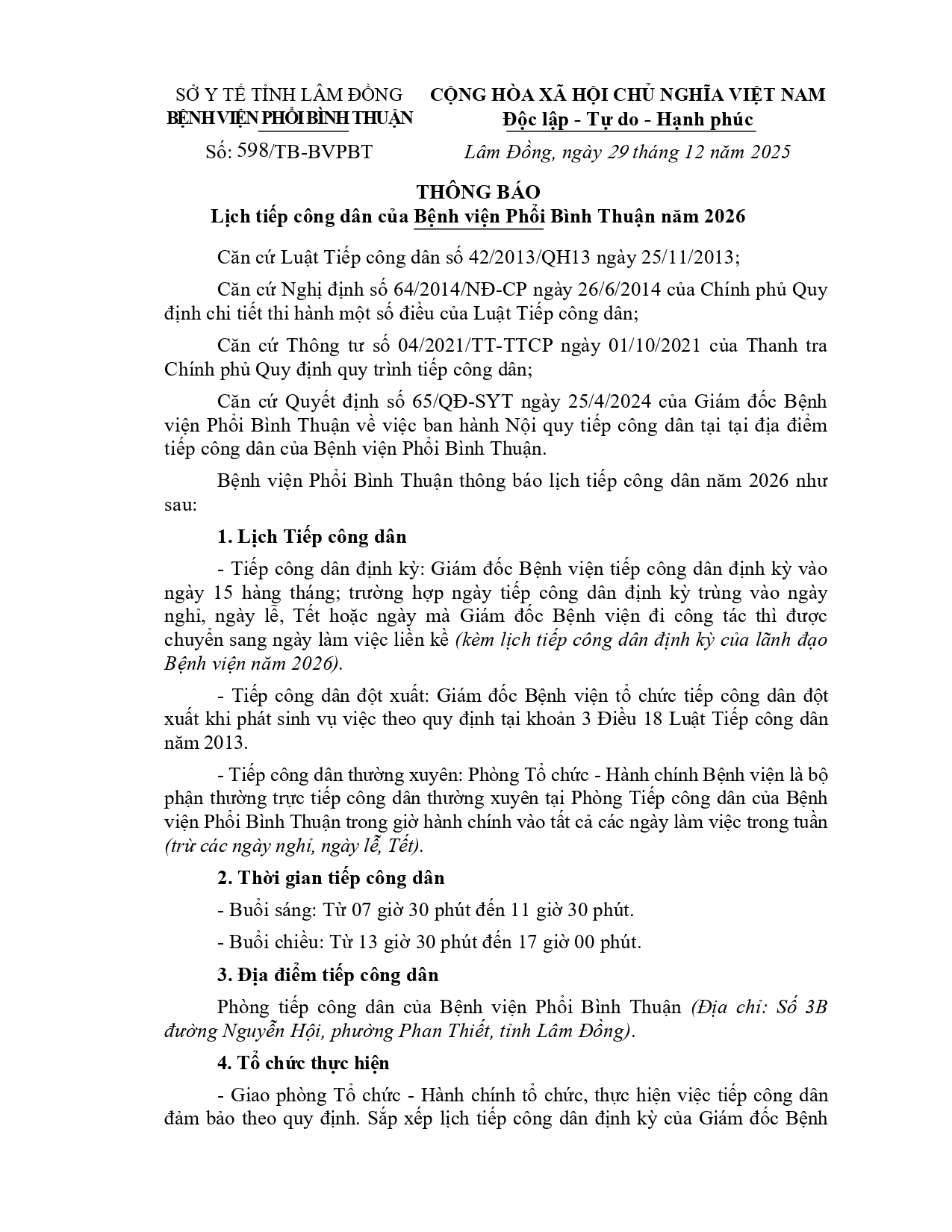 Lịch tiếp công dân của Bệnh viện Phổi Bình Thuận - năm 2026