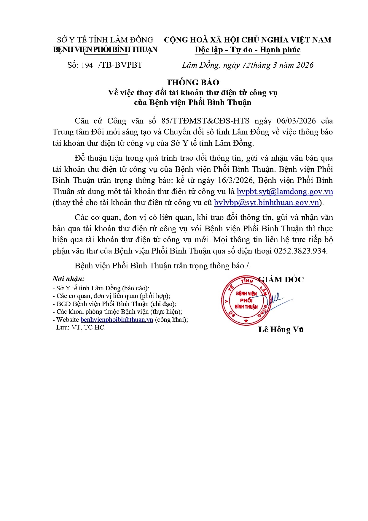 THÔNG BÁO Về việc thay đổi tài khoản thư điện tử công vụ của Bệnh viện Phổi Bình Thuận