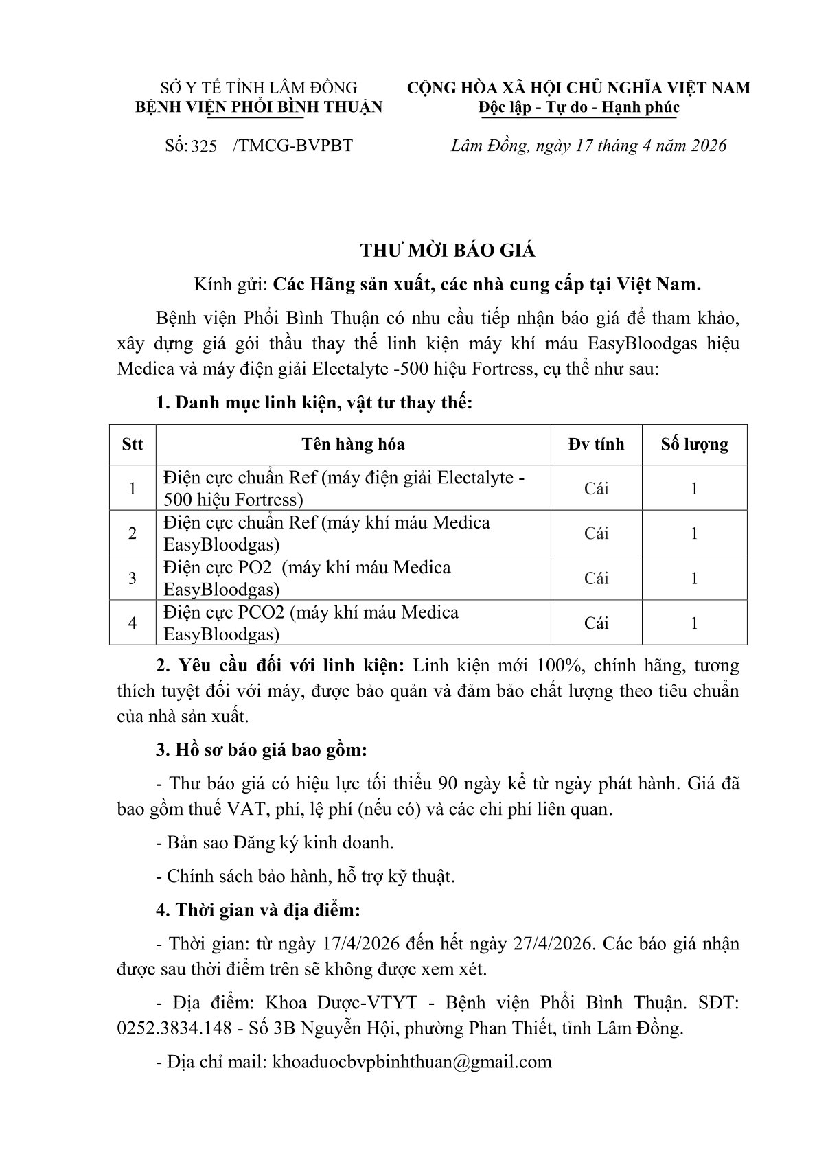 Thư mời chào giá: thay thế linh kiện máy khí máu EasyBloodgas hiệu Medica và máy điện giải Electalyte -500 hiệu Fortress